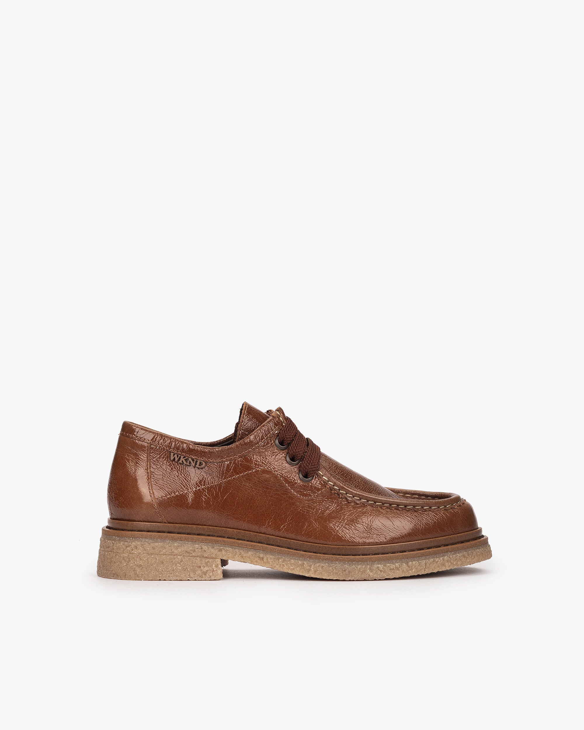 Sapatos baixos de couro envernizado marrom com cadarços. Um modelo que reinventa a forma clássica do sapato Oxford e lhe dá um toque moderno, graças à sola áspera e às costuras que adornam a parte superior.