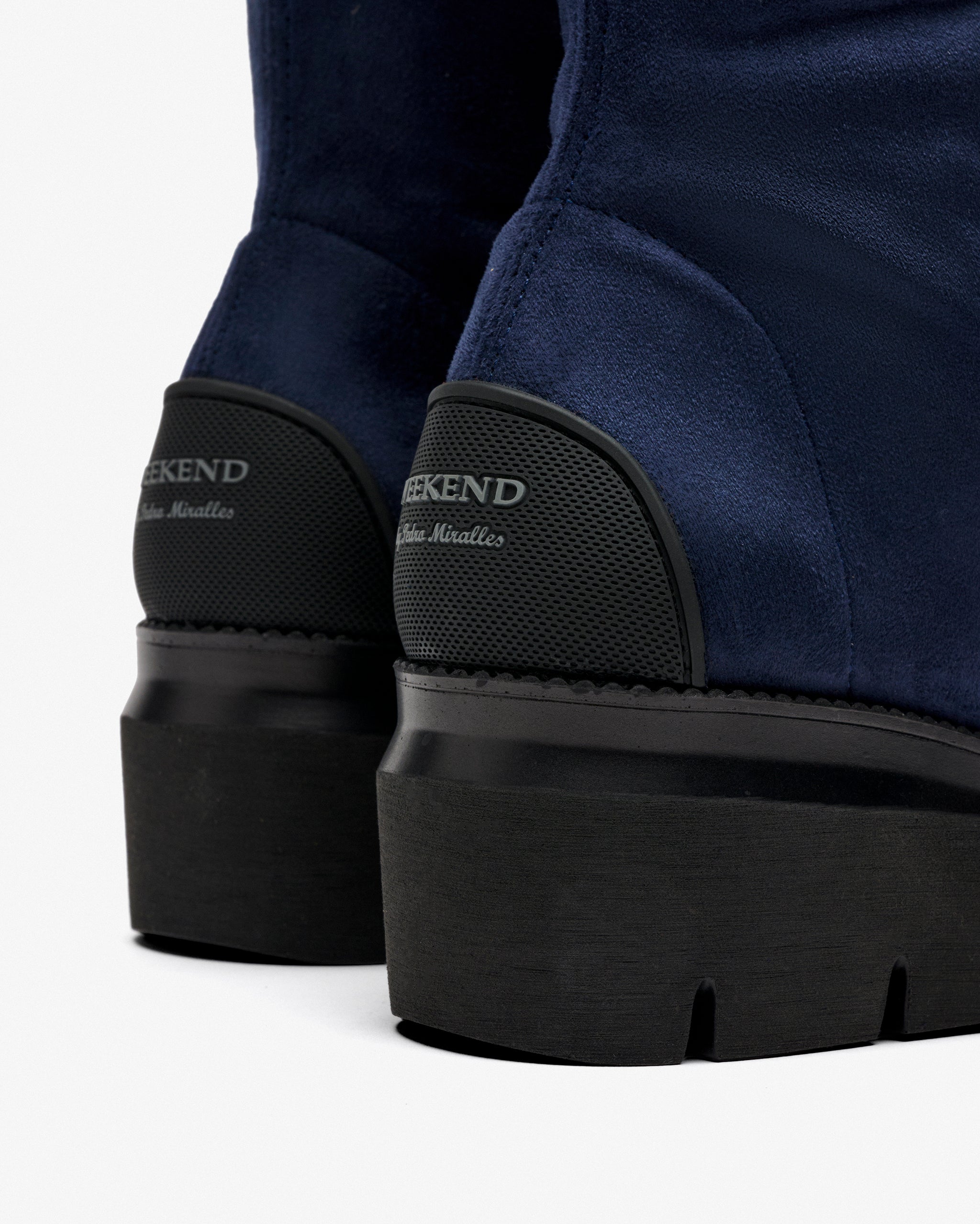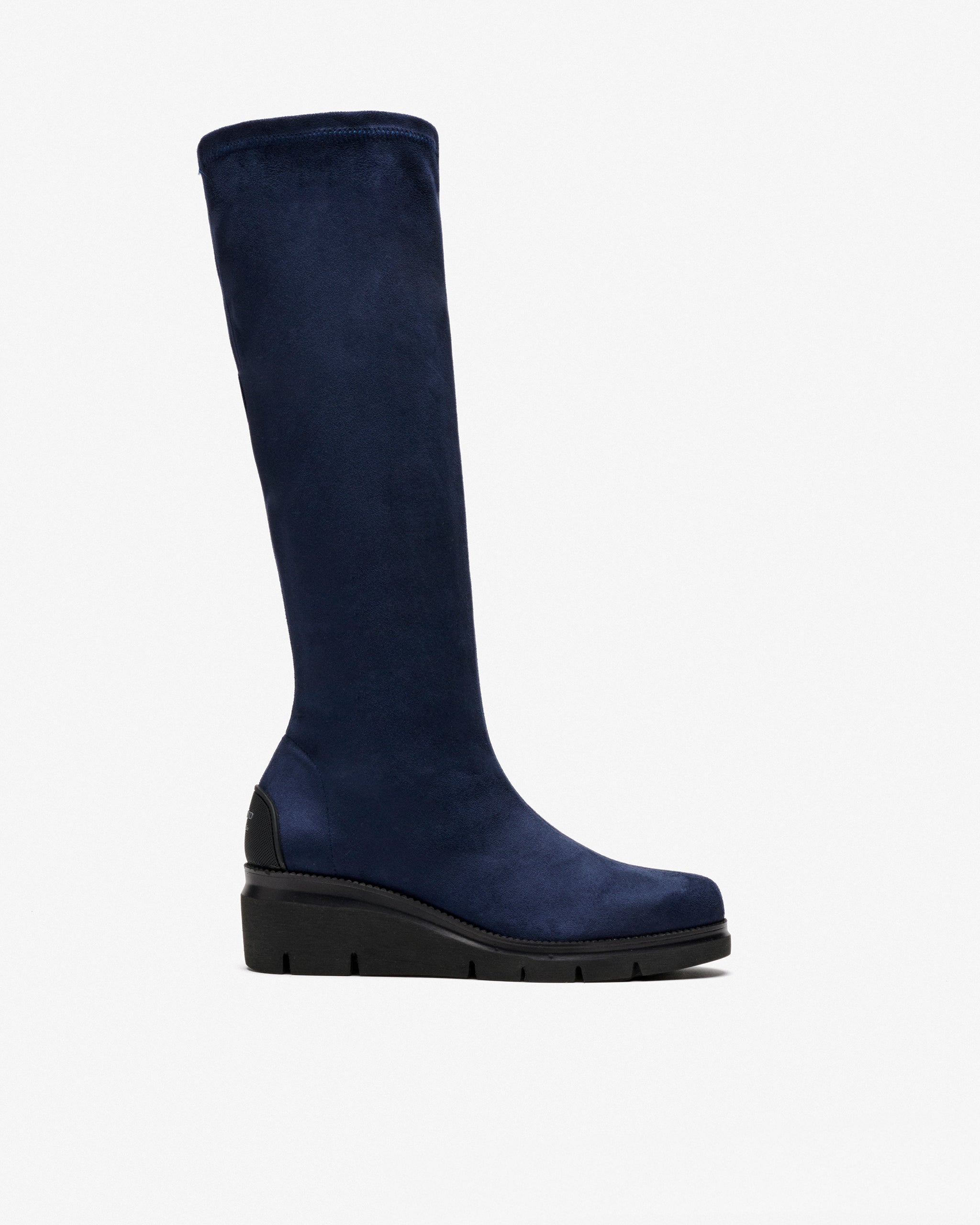 Botas de tecido elástico com efeito de camurça azul marinho. Projetado para combinar estilo e conforto. Seu tecido ajustado abraça perfeitamente a perna, enquanto a plataforma adiciona altura. Sua forma larga garante um ajuste espaçoso e agradável mesmo após horas de uso.