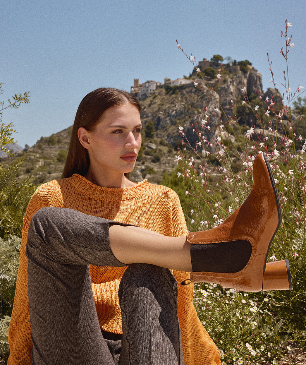 Botim em couro envernizado marrom. Esta bota é ideal para dar um toque especial aos seus looks de inverno. Seu salto sensível lhe dará altura para elevar o look e conforto para usá-la o dia todo.