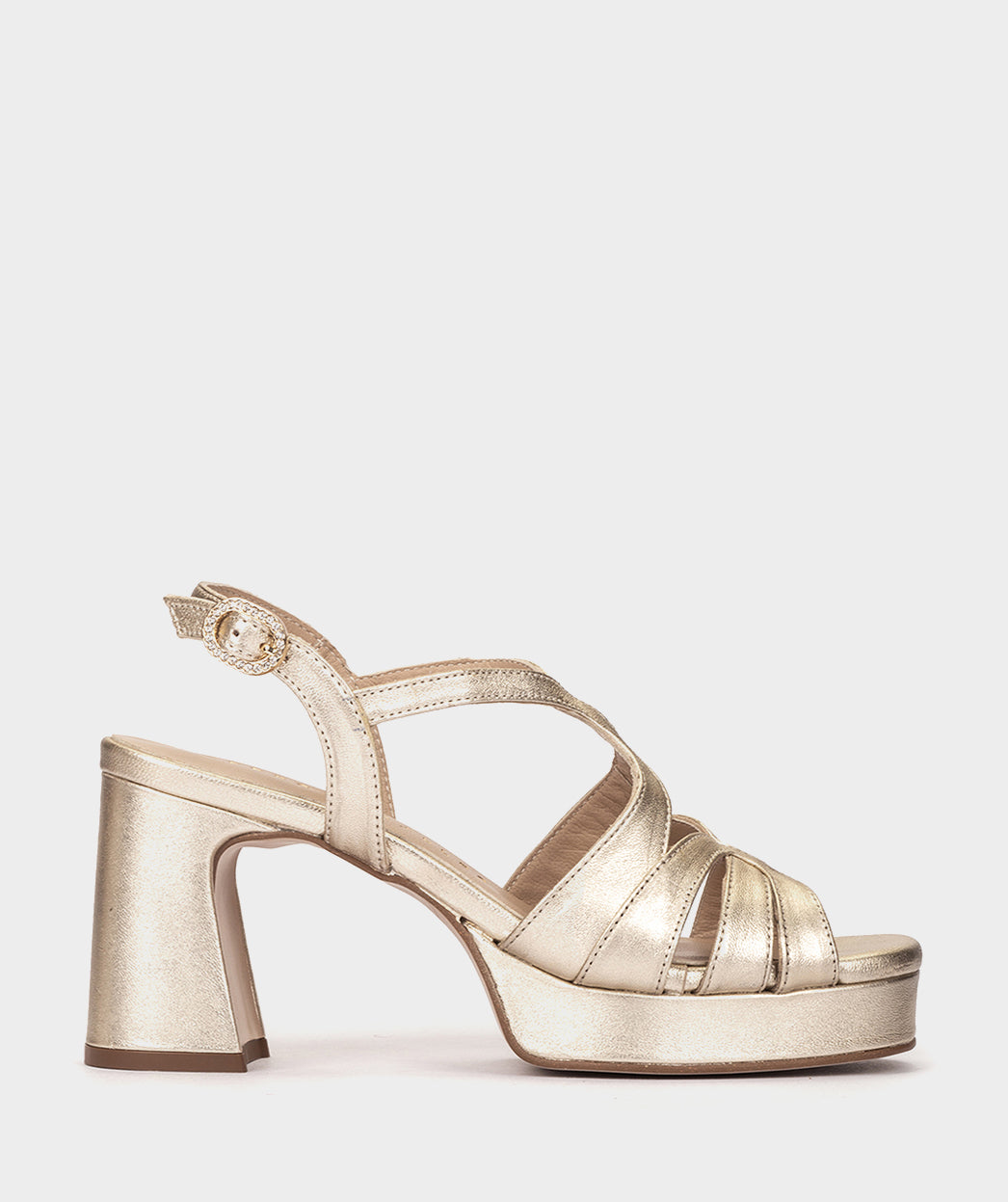 Sandálias de salto alto em pele platinada. Concebidas com tiras grossas cruzadas e fecho de fivela no tornozelo para um ajuste ideal.