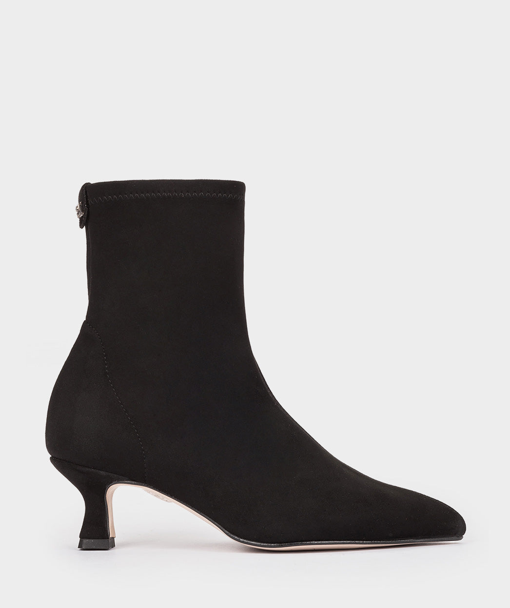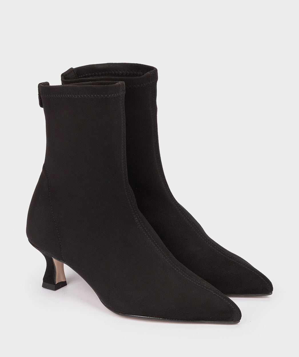 Botim em tecido elástico com efeito camurça preta. Este material vai se adaptar ao seu pé e vai apoiá-lo o dia todo, sua ponta pontiaguda vai estilizar todos os seus looks.