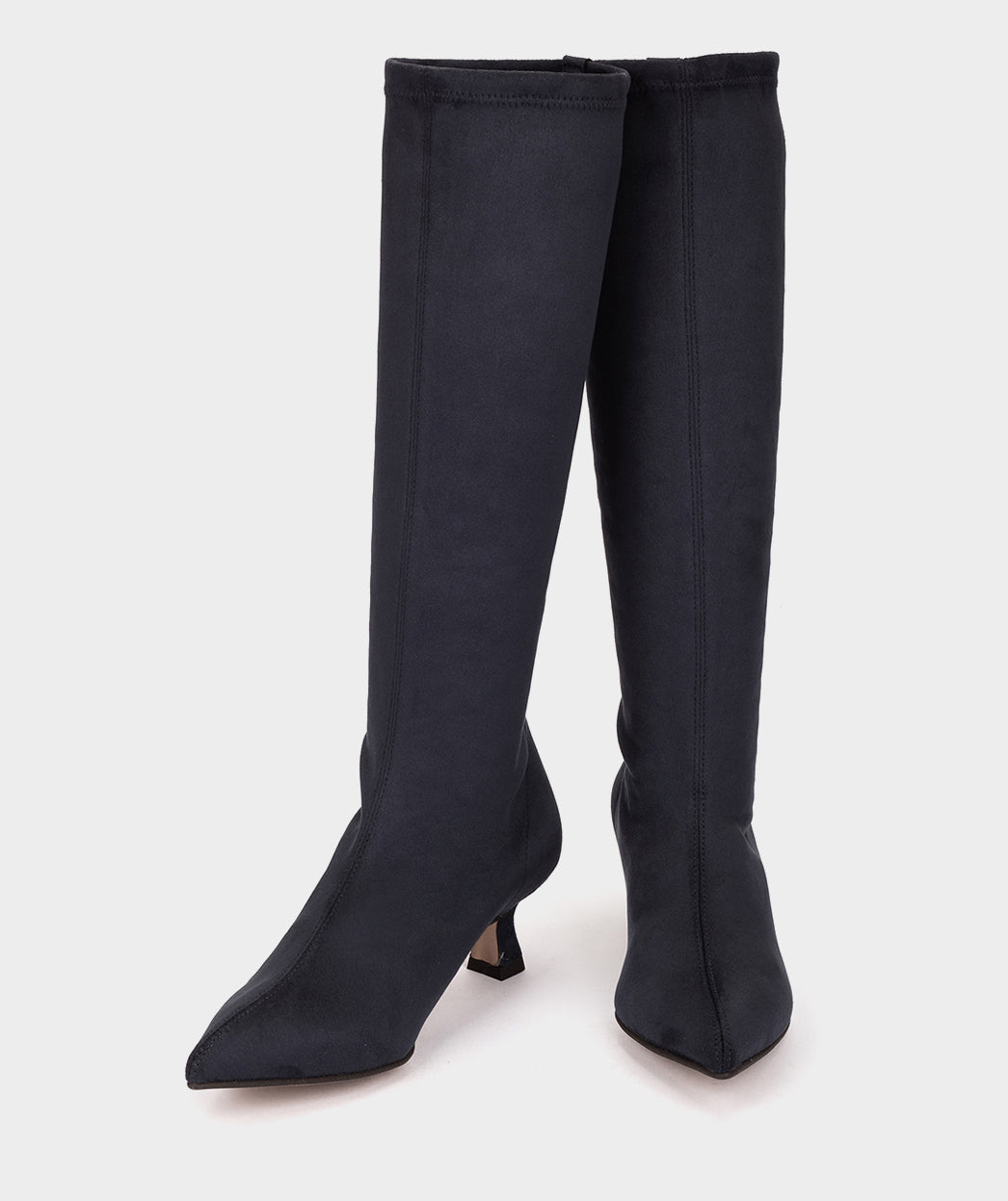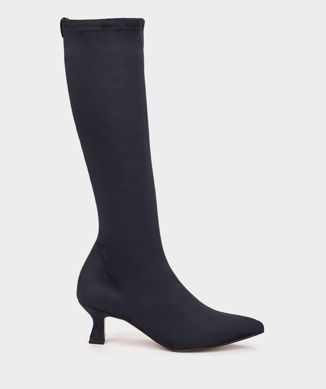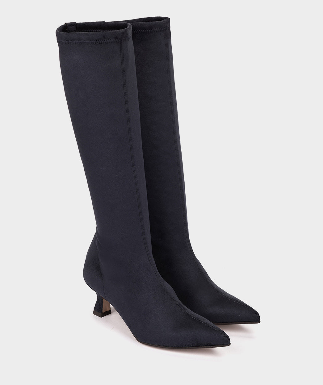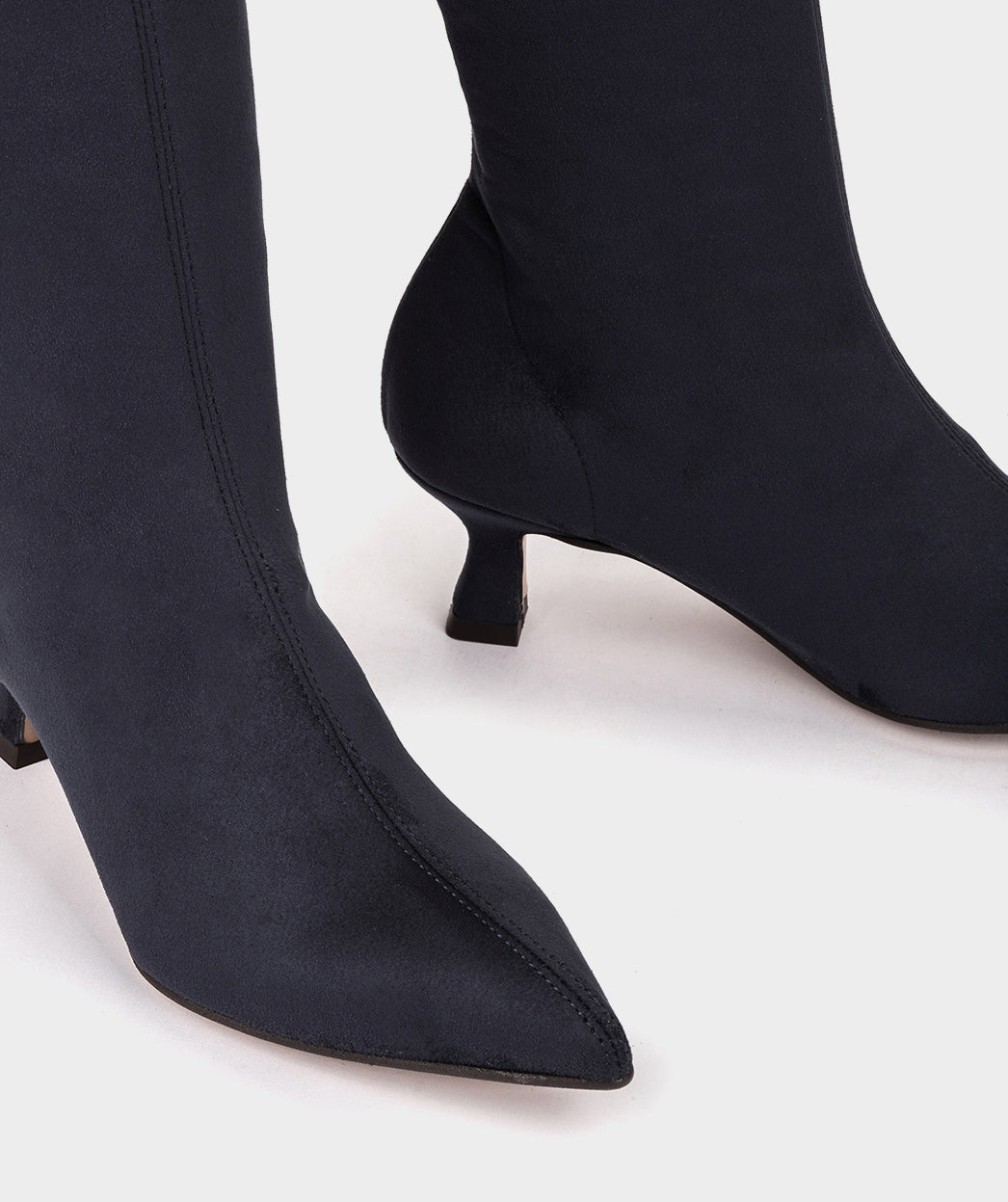 Botas de salto alto confeccionadas em tecido elástico efeito camurça azul marinho. Estas botas são básicas, o seu material elástico é ideal tanto para o uso diário como para qualquer evento.