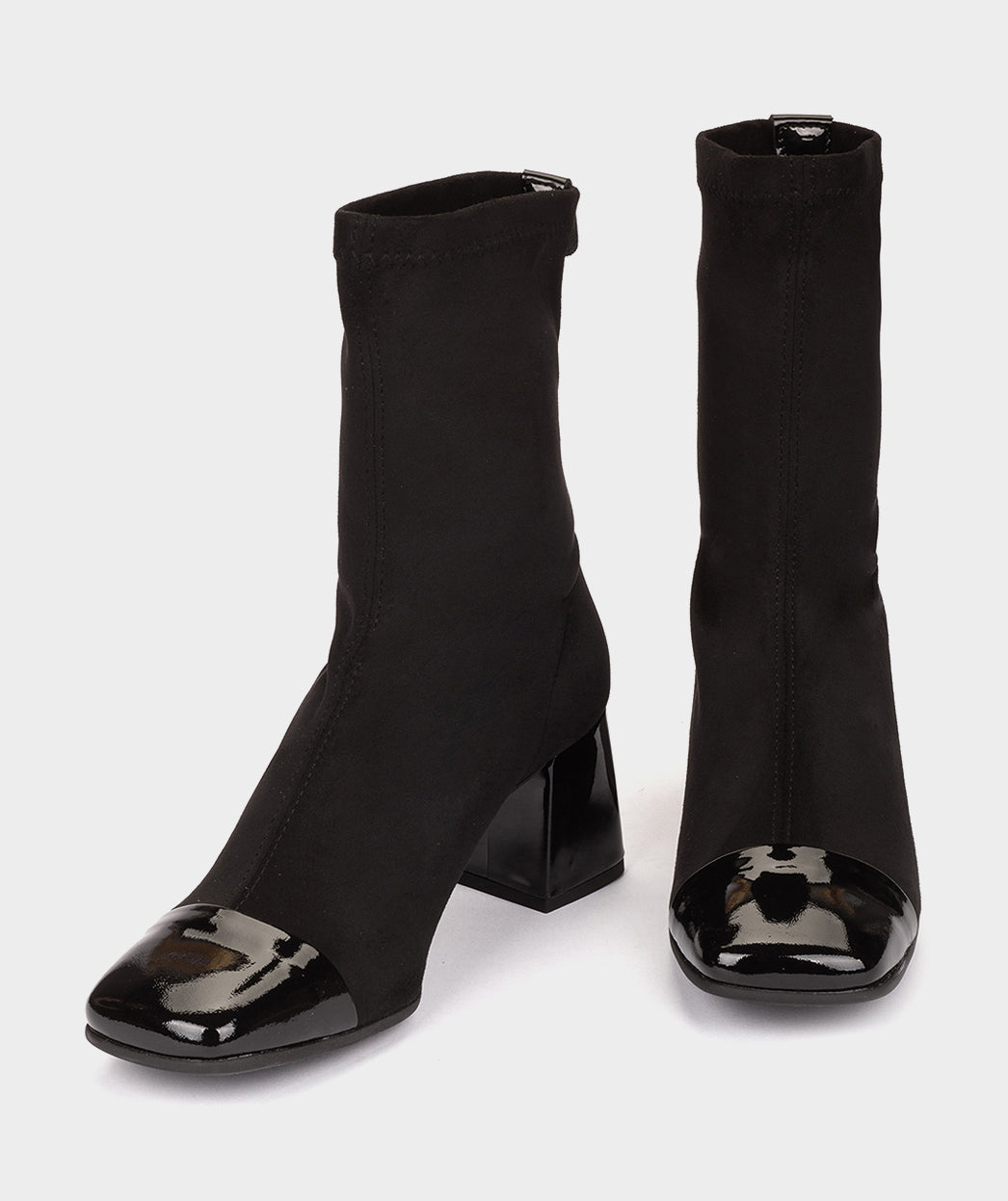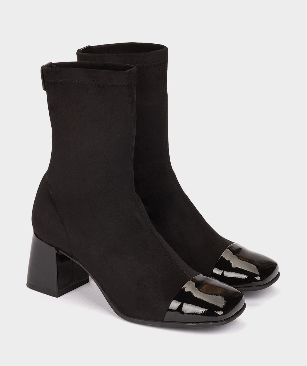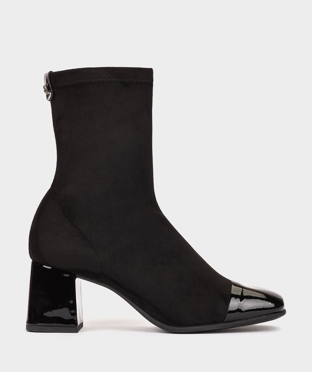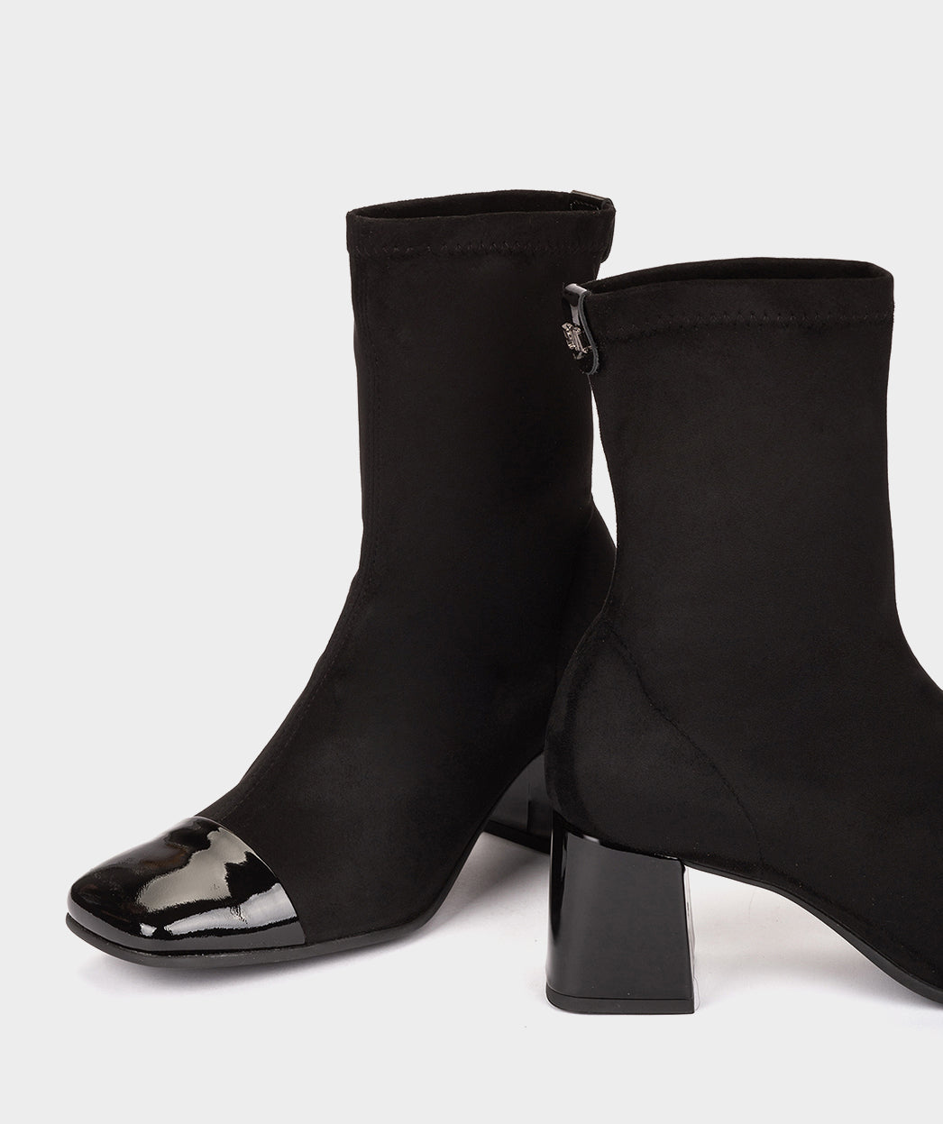 Botim preto em tecido elástico com efeito camurça e detalhes em couro envernizado. Um modelo que combina o estilo clássico da sua silhueta com o toque ousado dos detalhes estampados na biqueira e no calcanhar. São perfeitos para dar um toque especial aos seus looks.