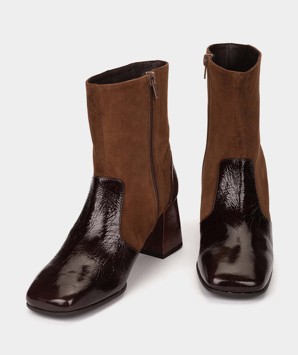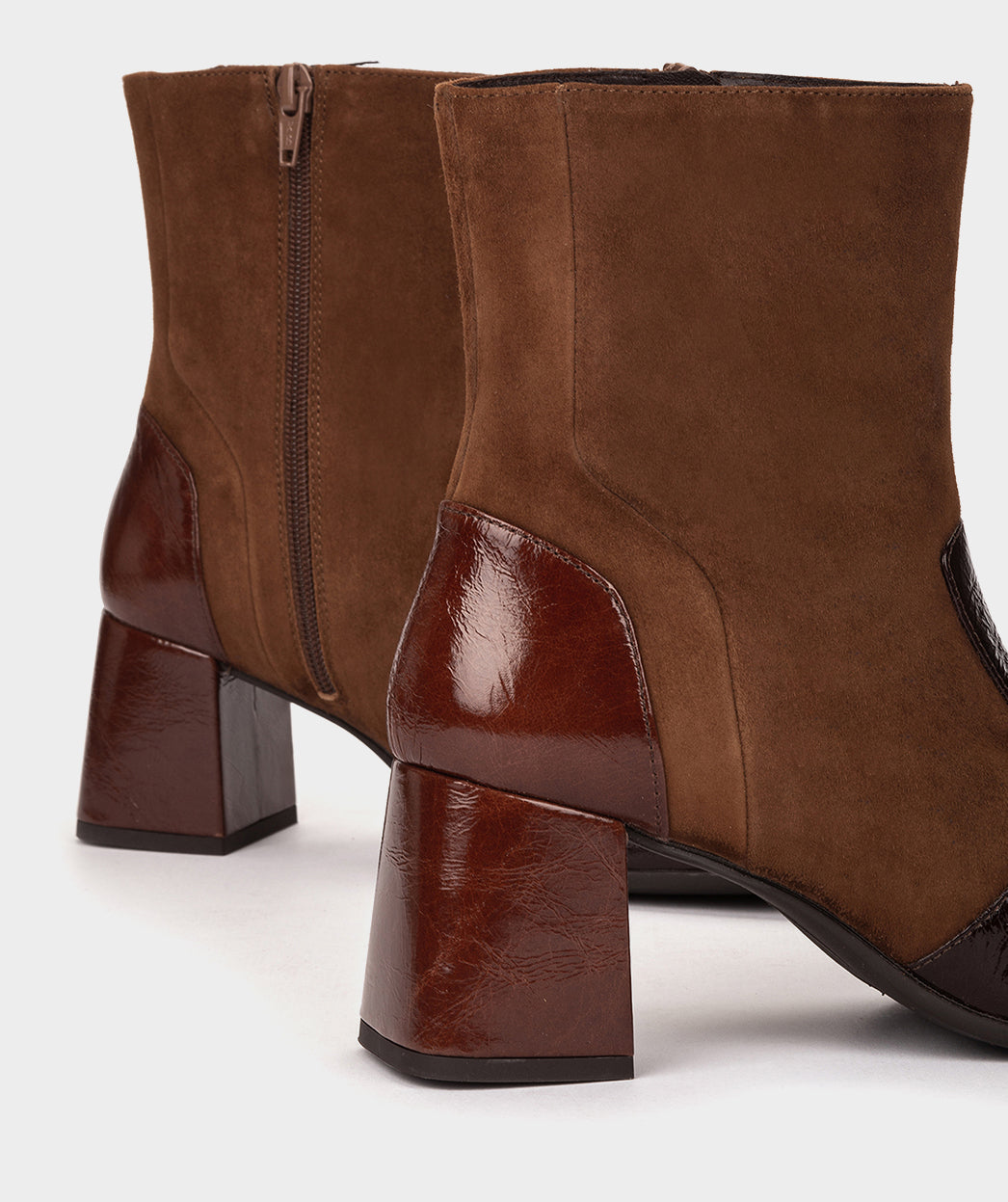 Botim em camurça marrom. O modelo VERMONT destaca-se pela originalidade, graças ao design peculiar da biqueira e do calcanhar. Atreva-se a dar um toque especial aos seus looks do dia a dia com os botins VERMONT.