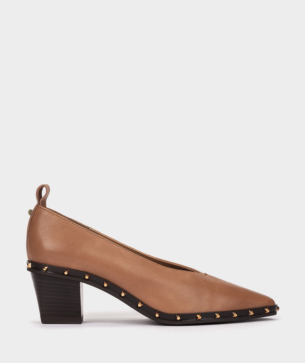 Saltos de couro marrom com tachas. O ponto forte deste modelo é a sua silhueta adornada com tachas. Além de serem um calçado que se destaca pelo design, o conforto também desempenha um papel fundamental, graças ao salto largo. Mas o melhor é que você não terá que tirá-los o dia todo.