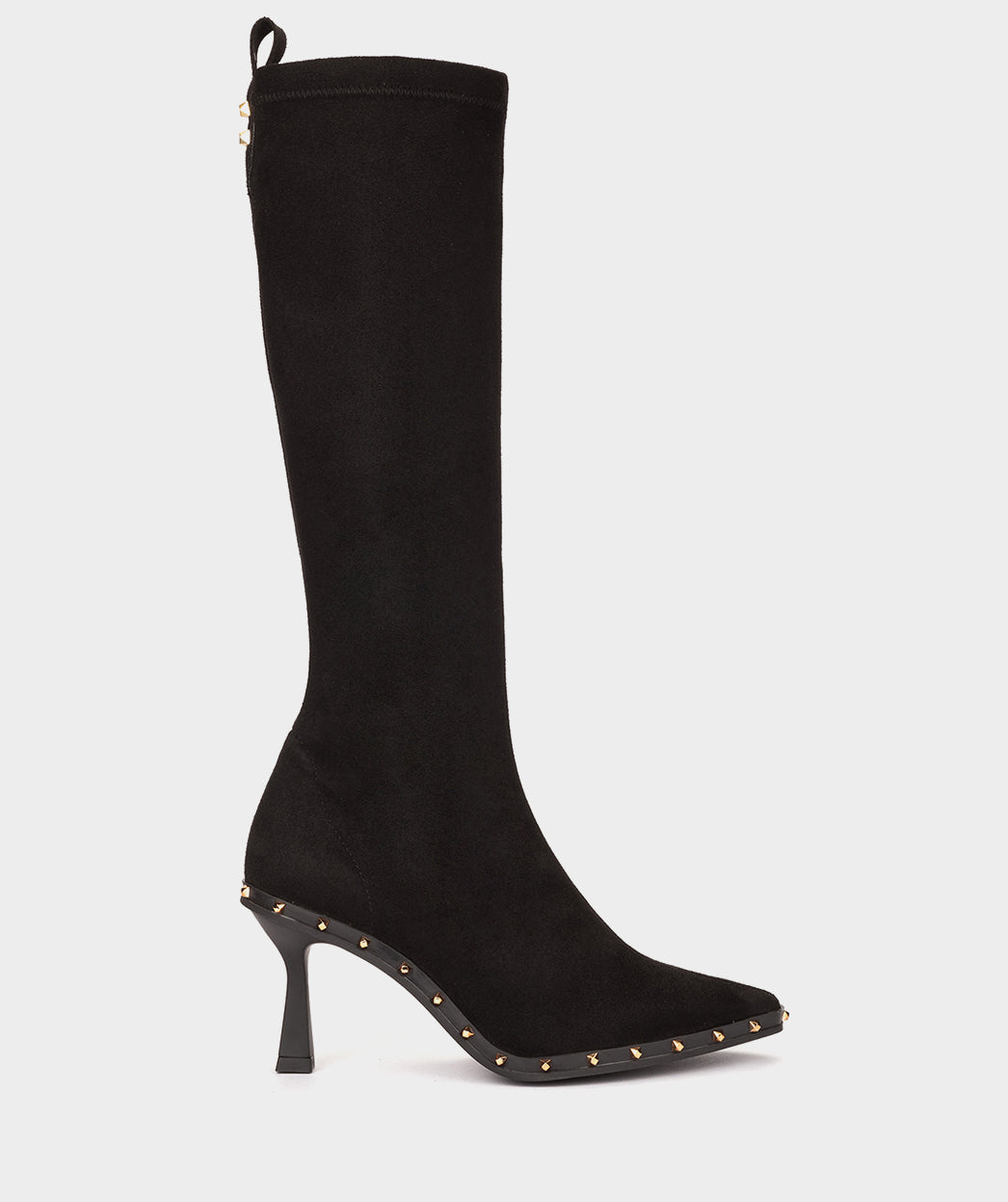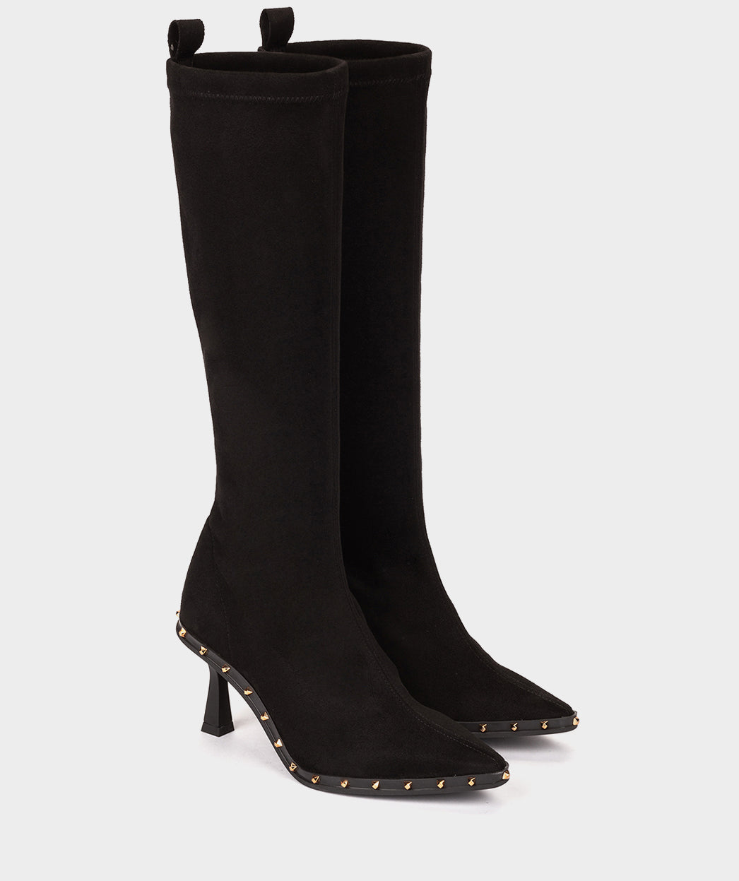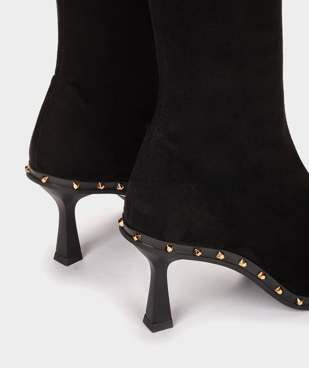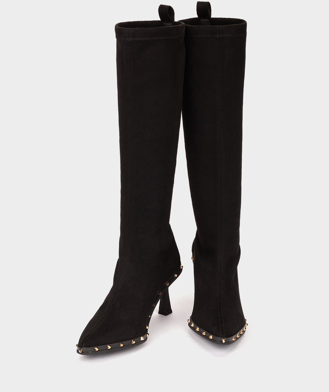Bota alta confeccionada em tecido elástico preto. As botas perfeitas para exibir onde quer que você vá e dar um ar ousado aos seus looks. As tachas que marcam a silhueta dão-lhe um toque moderno.