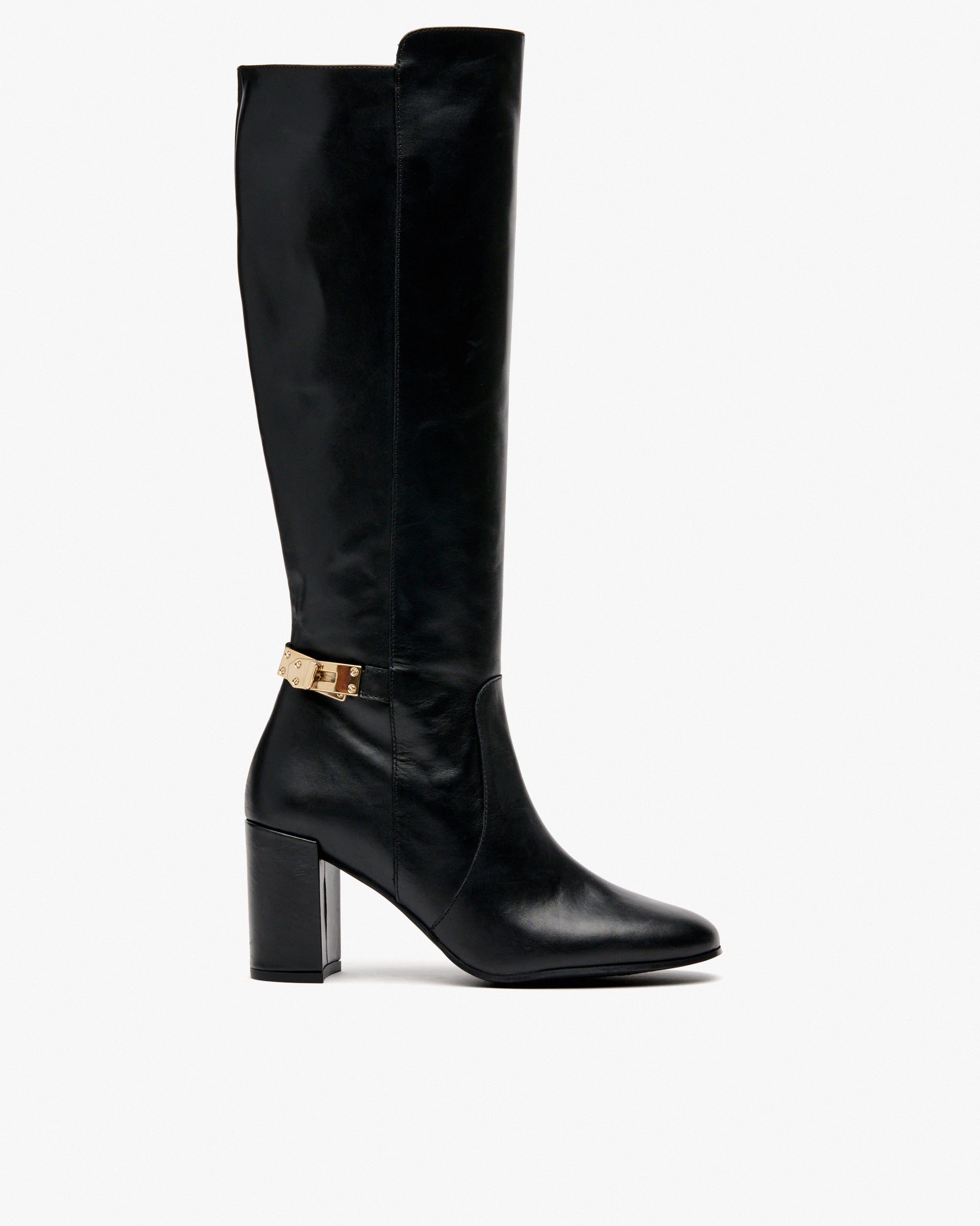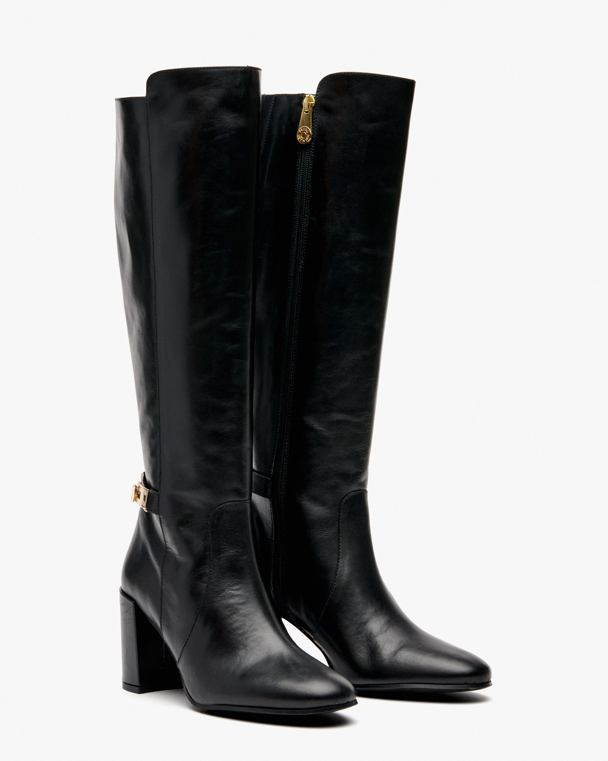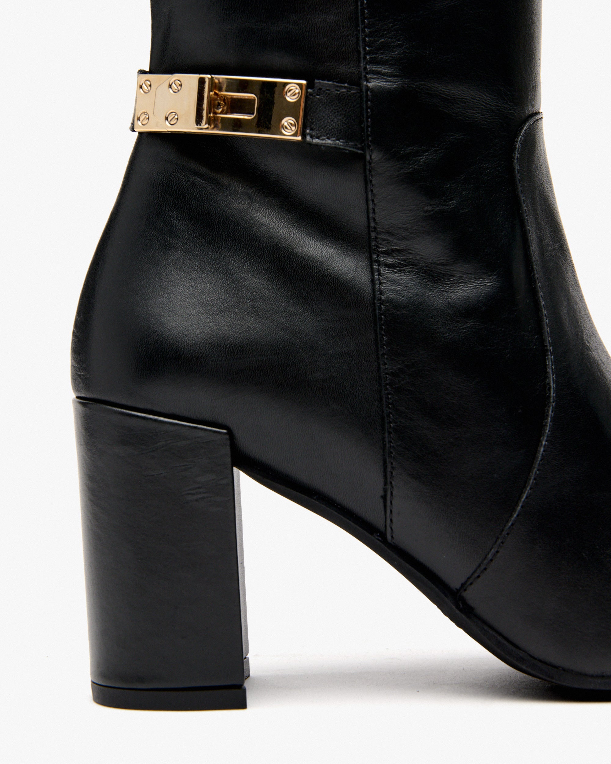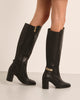 Botas de salto alto de couro preto com ornamento. O modelo CUBEL foi concebido para combinar carácter e elegância. Sua silhueta esbelta é realçada por um salto alto arrojado e uma fivela decorativa que adiciona um toque de sofisticação.
