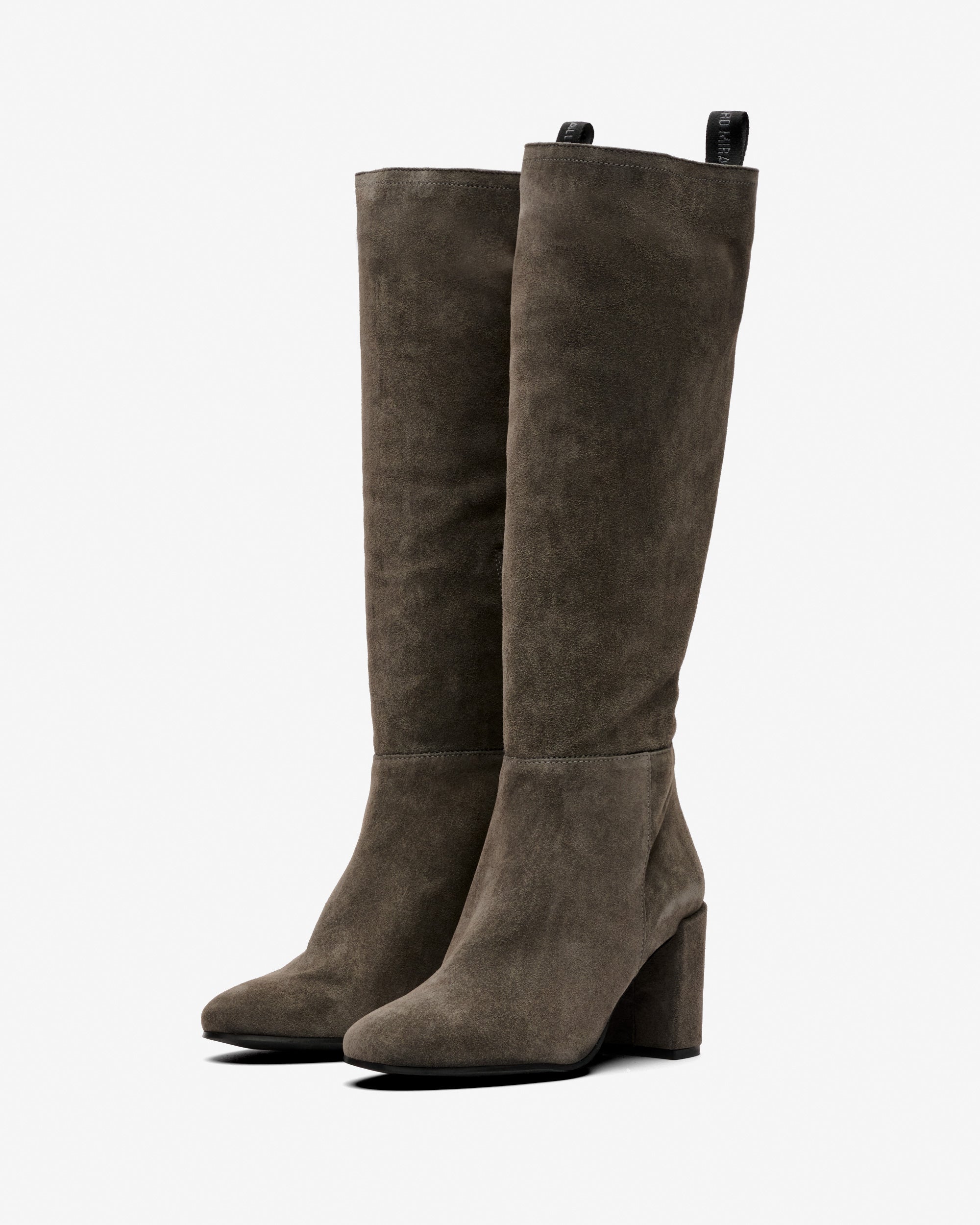 Botas de salto de camurça cinza. Um design elegante e intemporal, que se tornará o seu novo item básico do guarda-roupa. A altura do salto e o formato do dedo do pé estilizam a silhueta, tornando este modelo um design muito lisonjeiro.
