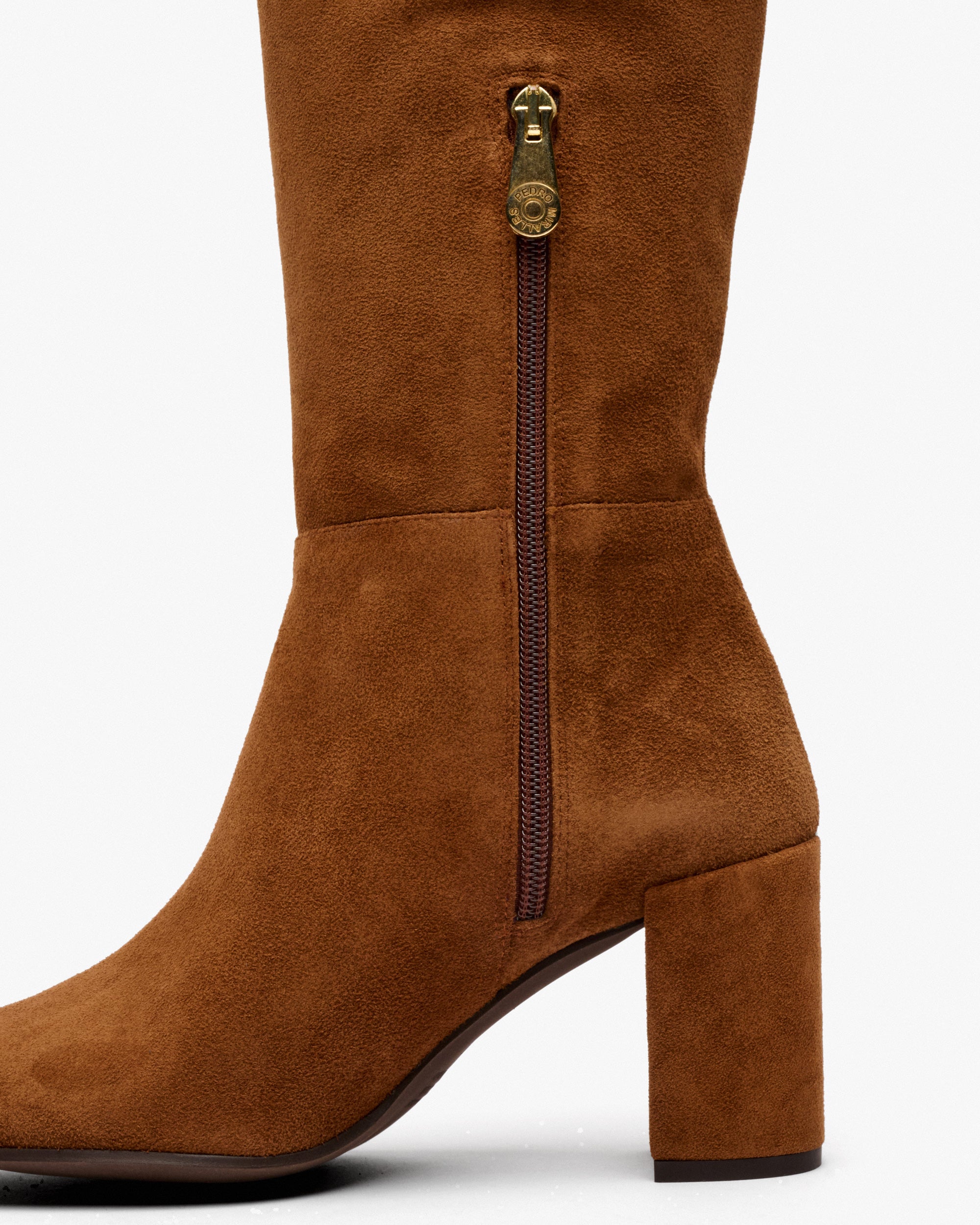Botas de salto de camurça marrom. Um design elegante e intemporal, que se tornará o seu novo item básico do guarda-roupa. A altura do salto e o formato do dedo do pé estilizam a silhueta, tornando este modelo um design muito lisonjeiro.