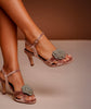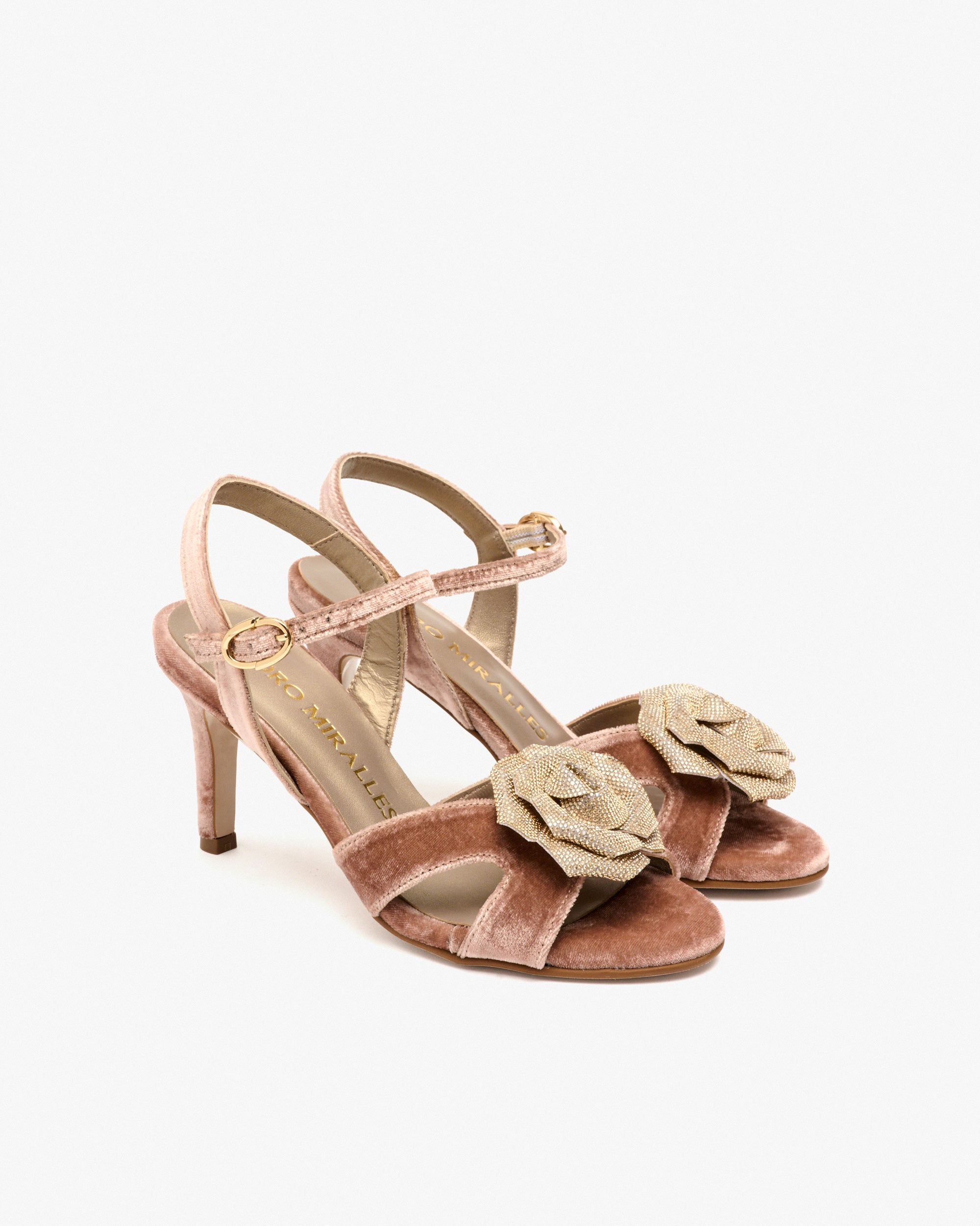 Sandálias de salto alto de veludo rosa com flor. Seu design refinado traz um toque de romantismo e glamour aos seus looks, graças à flor com glitter que chama toda a atenção. Perfeito para cerimônias, festas ou ocasiões especiais.