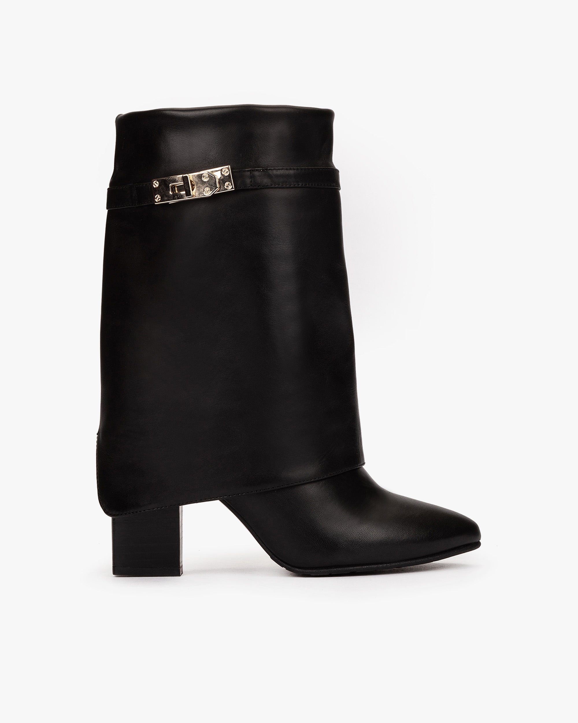 Botas de salto preto de couro. Um design moderno com referências à moda dos anos 2000. Seu eixo largo é tão confortável quanto favorecedor.