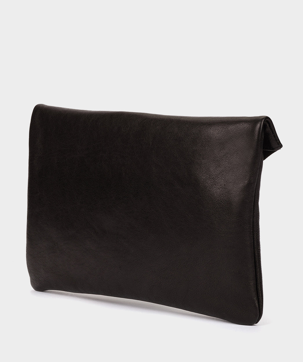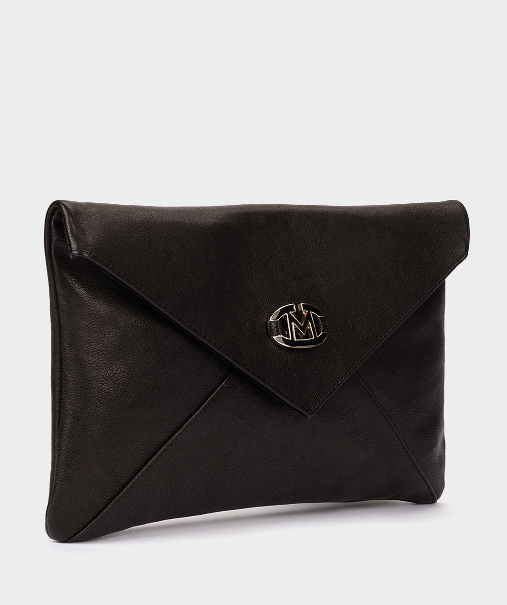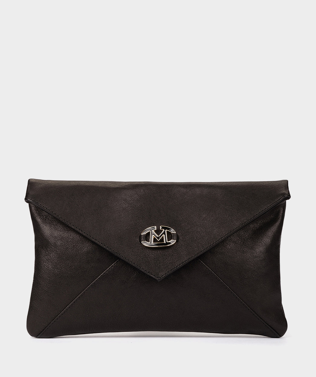 Bolsa de couro preta estilo envelope. Uma elegante bolsa de noite, cuja decoração em "M" realça a sofisticação do modelo. Um acessório atemporal perfeito para usar em seus próximos eventos. Possui fecho magnético.