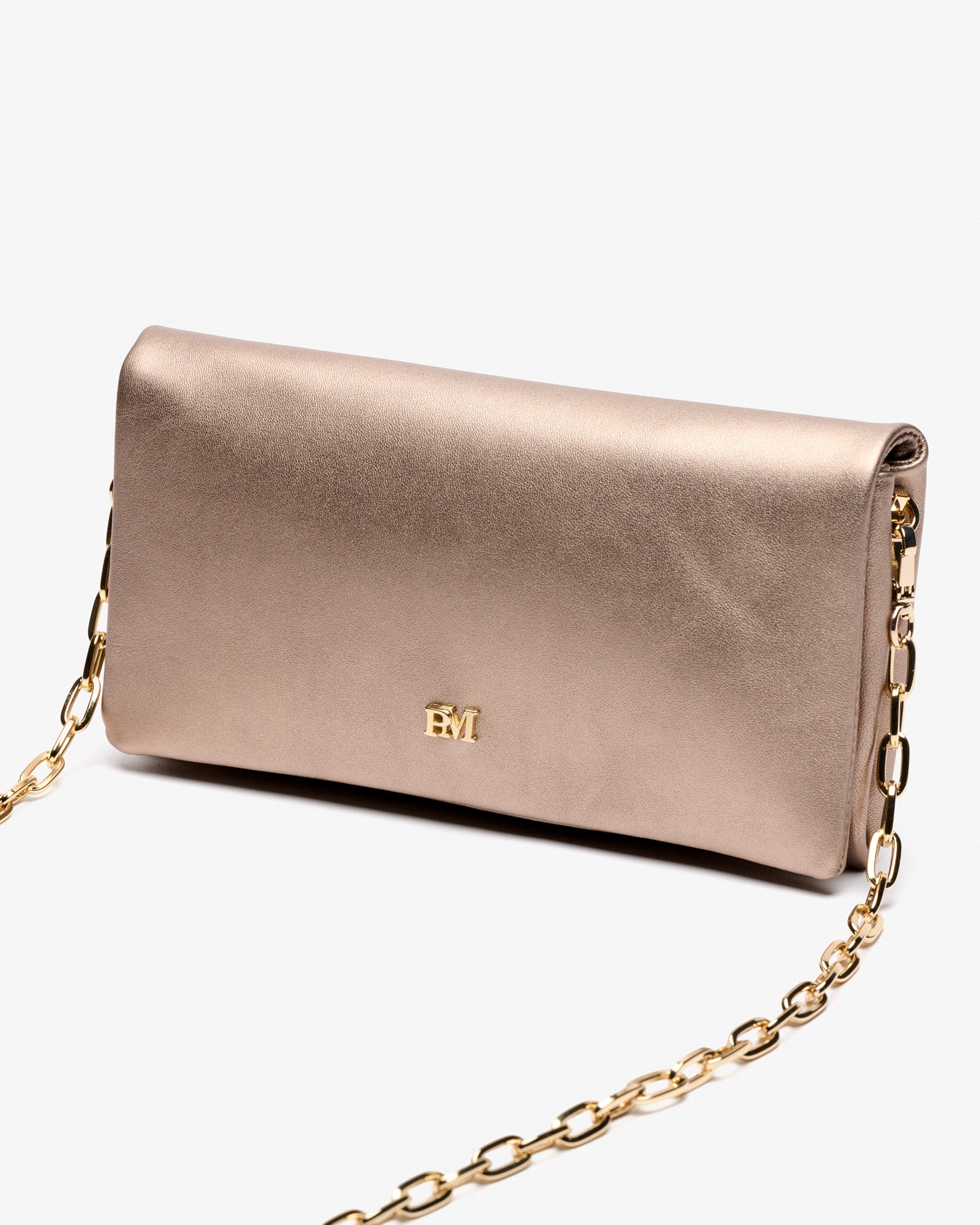 Bolsa de couro metálico para festas. Um modelo perfeito para usar em eventos e ocasiões especiais. Ele tem um fecho tipo ímã e seu tamanho é ideal para guardar seus itens essenciais. Ela tem uma corrente removível, então você pode usá-la como uma bolsa cruzada em vez de uma bolsa de mão.
